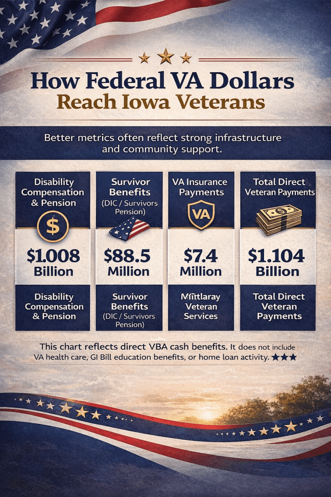 According to the U.S. Department of Veterans Affairs Geographic Distribution of Expenditures report, Iowa veterans receive more than $1.1 billion each year in direct federal payments tied to disability compensation, pension, survivor benefits, and insurance programs (VA, 2024).