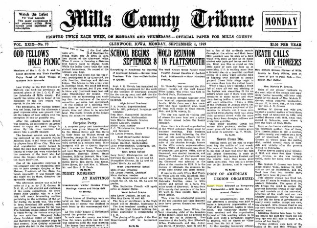 From The Glenwood Opinion, Thursday October 16, 1919, Local Post of American Legion Is Growing-Will Make Membership Drive Saturday-Ex-service Men Should Join "Chaplain W. E. Robb of the One-Hundred and Sixty Eighth Iowa Infantry will speak at the Baptist church next Wednesday evening, October 22, on the subject, “The Price of Our Heritage.” Chaplain Robb … Continue reading Chaplain W. E. Robb Visits Glenwood for Membership Drive