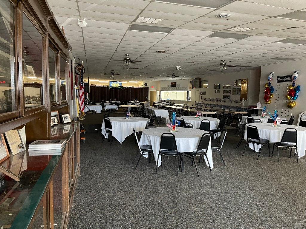 Very large facility with large, heavy duty round tables, 8 foot heavy duty rectangle tables, black metal chairs with dolly or metal folding chairs are available for use.